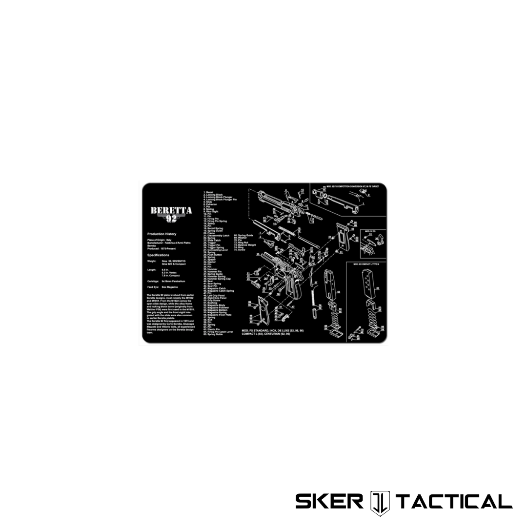 This Beretta 92 Mat features a diagram of the firearm’s parts assembly. The mat is a useful reference and surface to place parts when cleaning, performing maintenance, or disassembling the firearm.