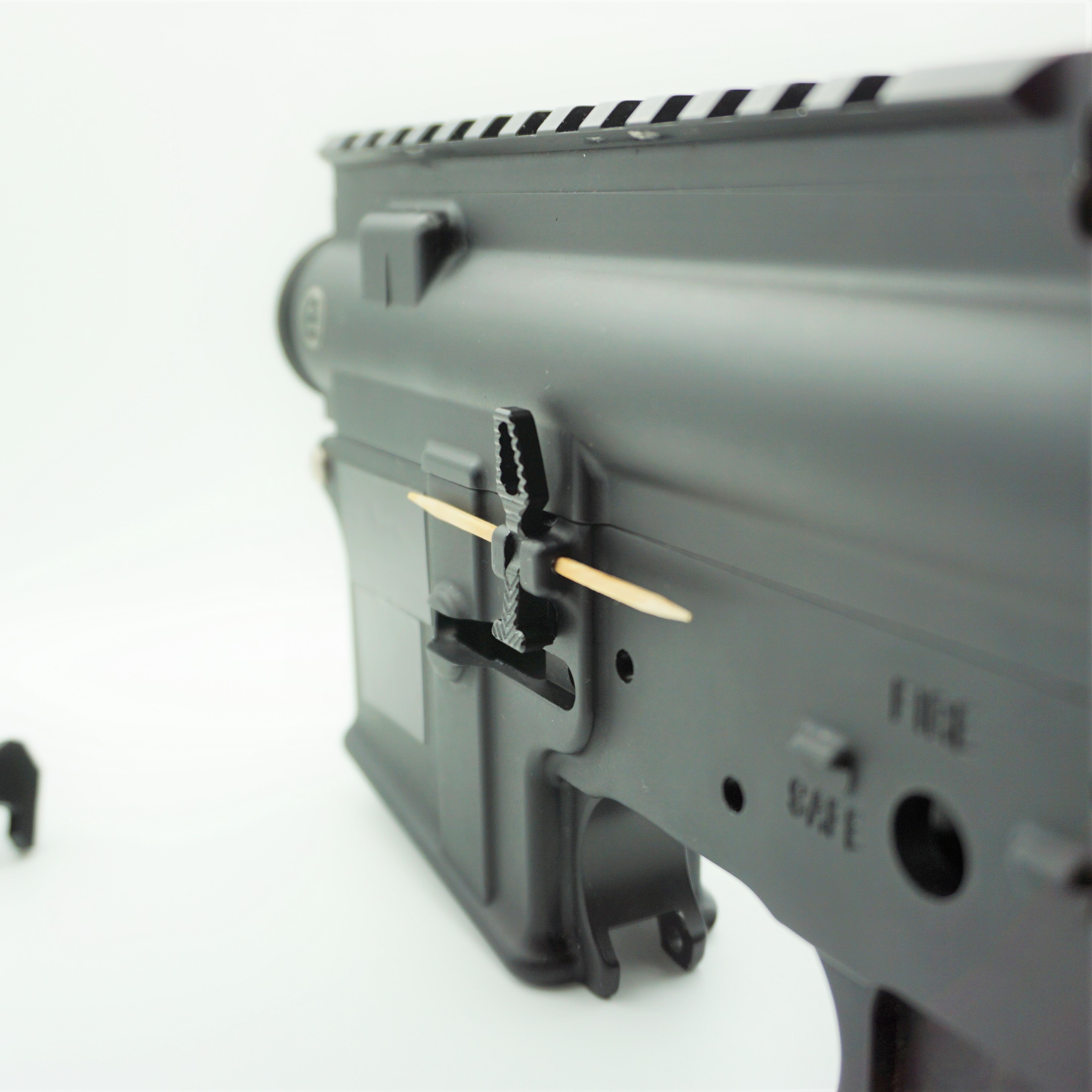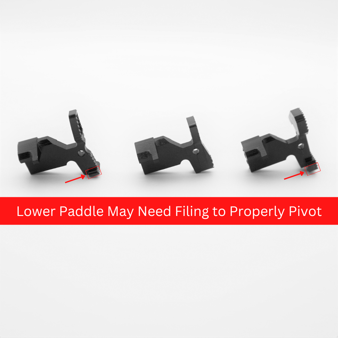 Notice: Due to the thickness of the lower paddle, this design may need to be filed down to fully pivot. However, in a Mil-Spec Receiver they seem to have enough clearance. In custom and aftermarket lowers they may need modification.