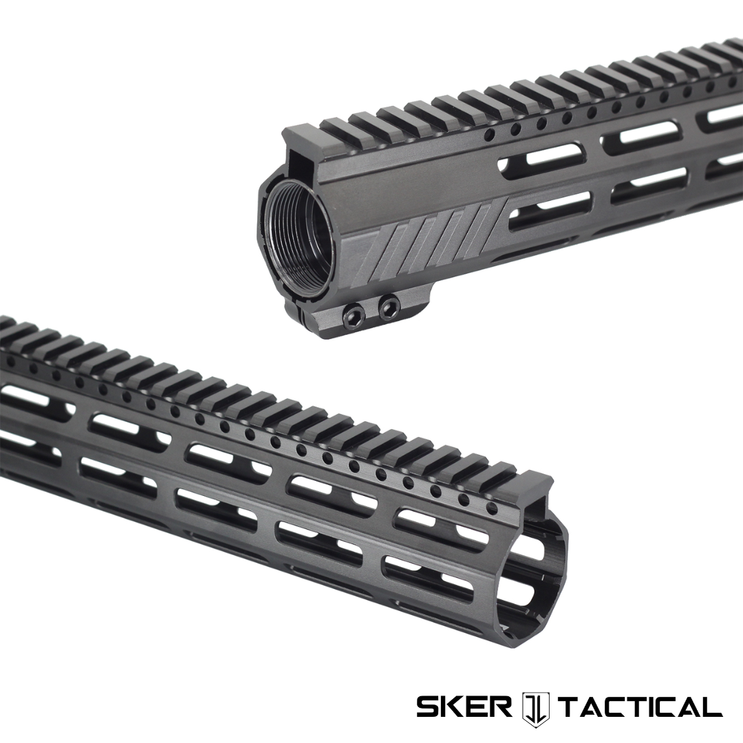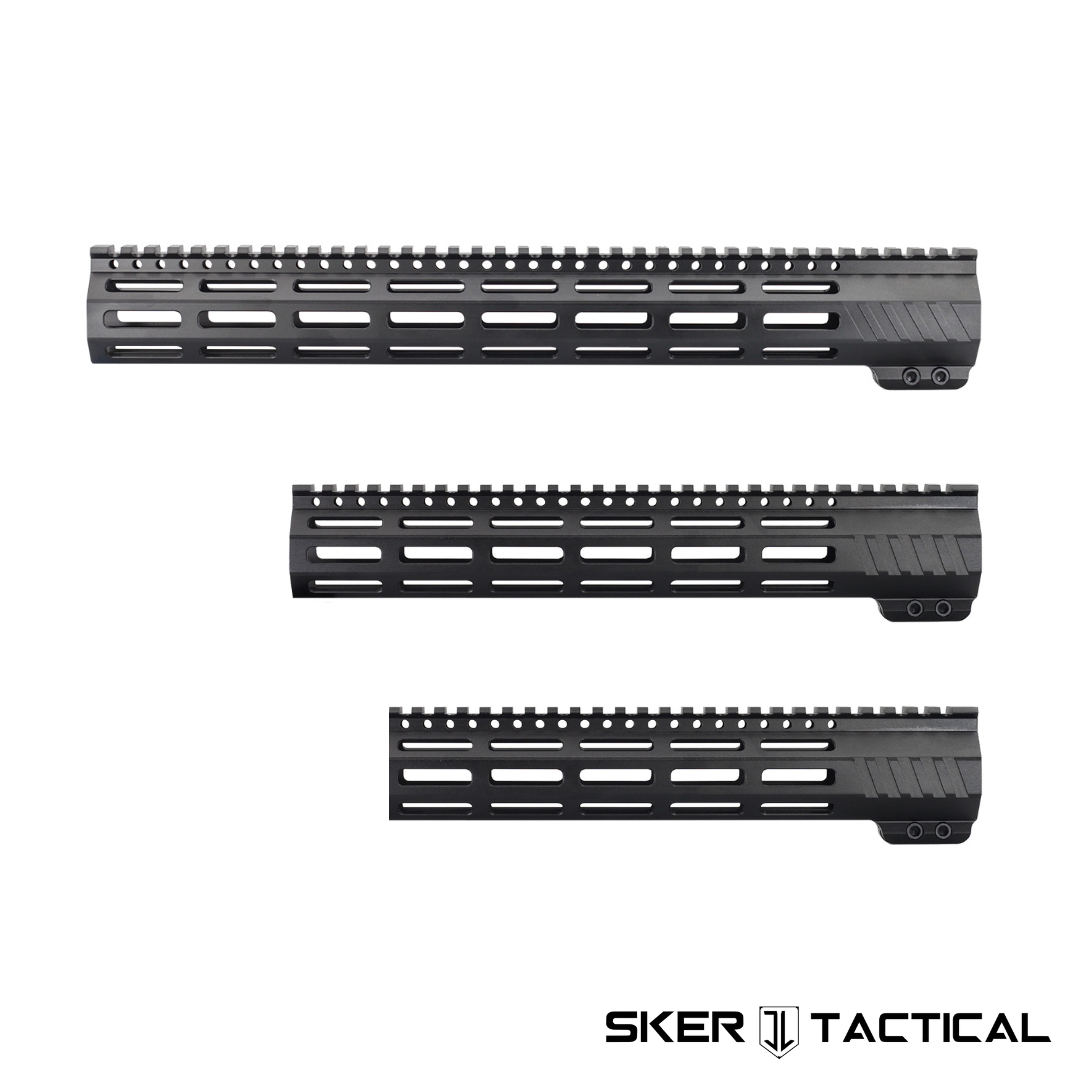 This Standard M-LOK AR-15 Handguard is compatible with AR-15 Upper Receivers. The Standard line features a top picatinny rail, m-lok slots on all 7 sides for mounting grips, accessories, weapon lights, lasers, and an aggressive yet refined serrated design around the base. This handguard starts from a custom 6061-T6 extrusion and every exterior surface of the handguard is machined to ensure a uniform and flat surface. It is Hard Coat Anodized, making this handguard extremely durable and corrosion resistant. Additionally, the Standard Line does not come with anti-rotation tabs, ensuring the handguard is compatible with every upper on the market. The mounting mechanism ensures that there is no forward movement and the 6061-T6 aluminum barrel nut has been engineered for gas tube clearance, which avoids the need to be indexed, making installation extremely easy. The rail comes in 3 sizes – 10″, 12″, and 15″, and includes the handguard, barrel nut, and 2x mounting screws. This handguard is a great upgrade and is compatible with AR-15 Upper Receivers.